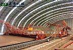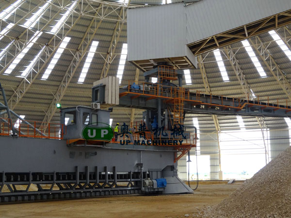 圓形料場橋式刮板混勻堆取料機,適用于原料的預(yù)均化堆場。占地面積小、可連續(xù)進(jìn)行堆料、取料作業(yè),全自動程序控制。是水泥、煤炭等散狀原料理想的均化設(shè)備。該設(shè)備的主要特點是:堆取料機采用人字形堆料和全斷面取料的堆取料工藝。堆料機在PLC程序下,堆料臂往復(fù)回轉(zhuǎn),同時在一次往復(fù)回轉(zhuǎn)過程中完成從上升到下降的周期變幅變速運動,完成連續(xù)人字形堆料工藝。取料機通過運行在圓形軌道上的端梁圍繞中心柱的料場內(nèi)運行,同時料耙沿橋梁往復(fù)運行實現(xiàn)全斷面取料,然后通過刮板輸送系統(tǒng)將物料刮至中柱底部經(jīng)地坑膠帶機運出。