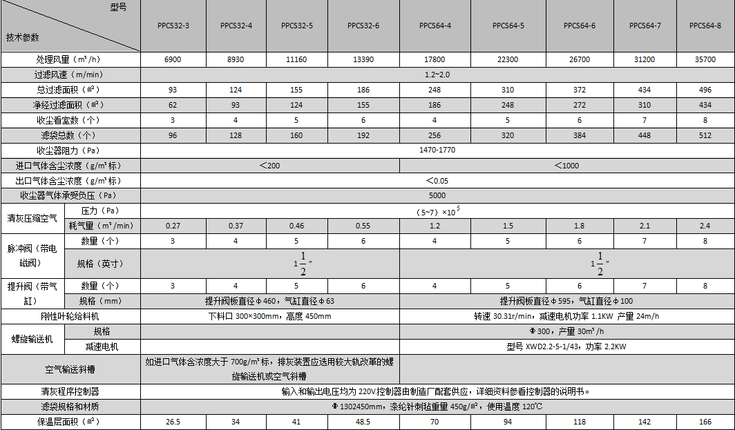 ·PPCS32型氣箱式脈沖袋收塵器技術參數(shù)表