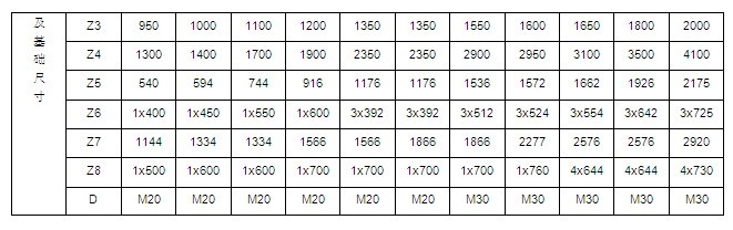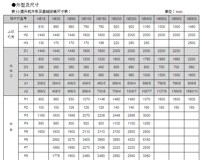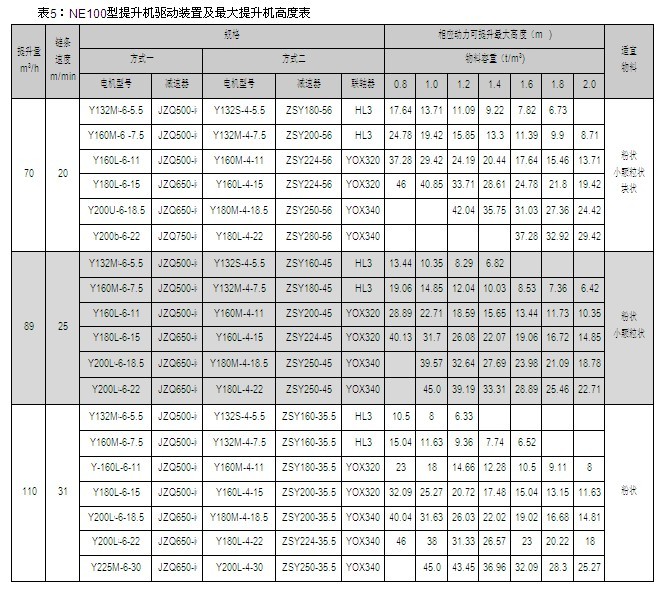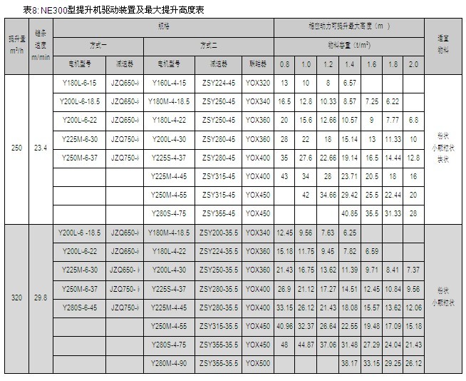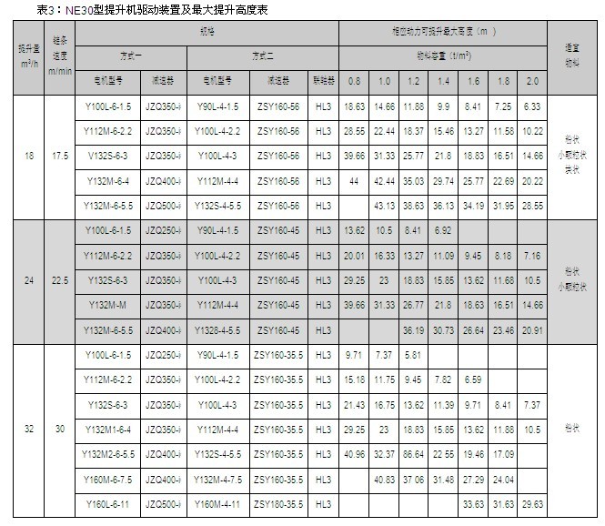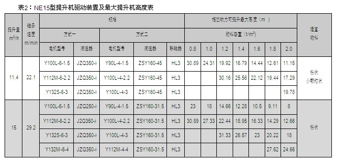 NE15、NE30、NE50、NE100、NE150、NE200、NE300、NE400型提升機的提升量上限、提升高度上限及動力配備表見表2~9,選擇NE500、NE600、NE800型提升機時,請與本公司技術(shù)部聯(lián)系。