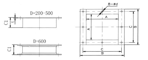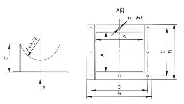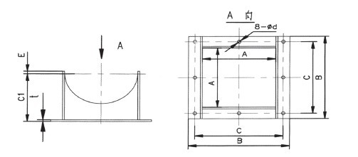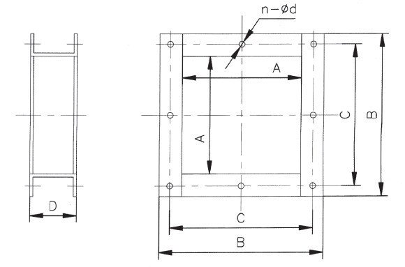 出料口的結(jié)構(gòu)表示如下圖,其系由鋼板折成的方形管及法蘭焊接而成,它不帶能關(guān)閉的出料口控制機構(gòu),在使用時將出料口焊于機殼上,其法蘭面與溜槽法蘭相聯(lián),裝配出料口的機殼還應(yīng)按出料口的內(nèi)孔尺寸開孔。