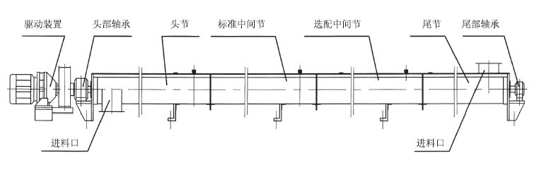 一臺螺旋機通常按驅(qū)動裝置、頭節(jié)、若干標準中部節(jié),選配中間節(jié),尾節(jié)順序組成,除頭節(jié)機殼和選配節(jié)外,各節(jié)螺旋及機殼均具有互換性,在出料端螺旋有清料裝置,安裝時注意位置。